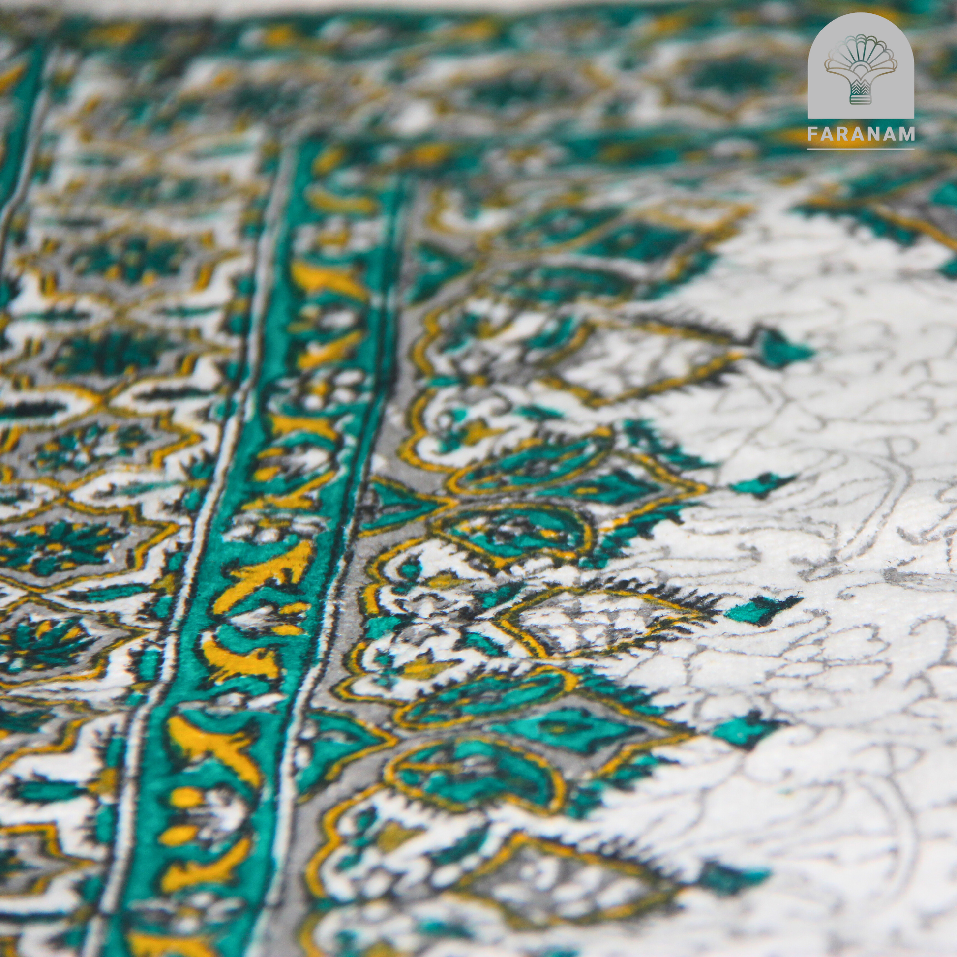 Inspired by Persian minimalism, the peaceful green and white tones reflect traditional designs that bring balance and calm, rooted in the spiritual artistry of Esfahan.